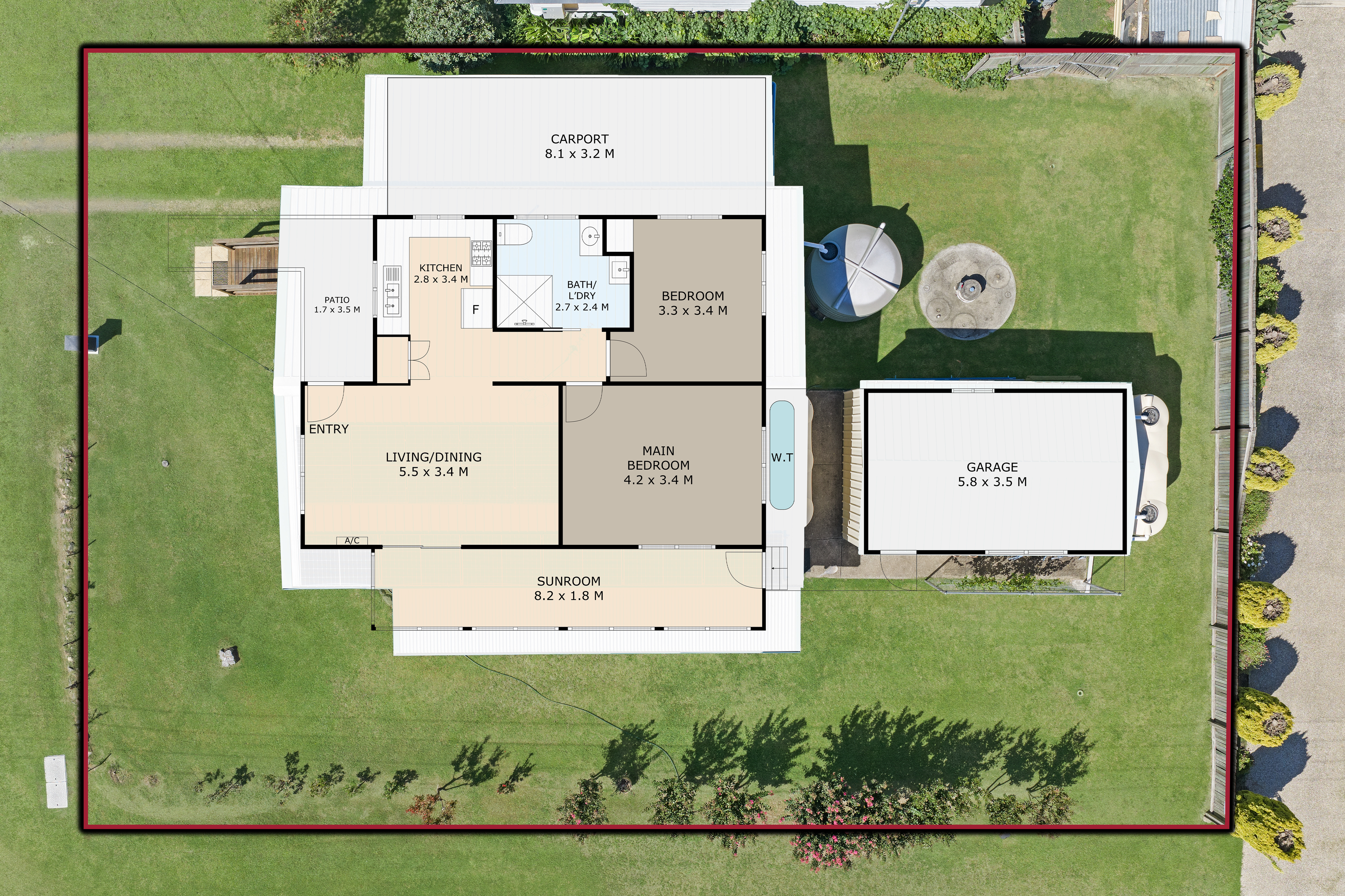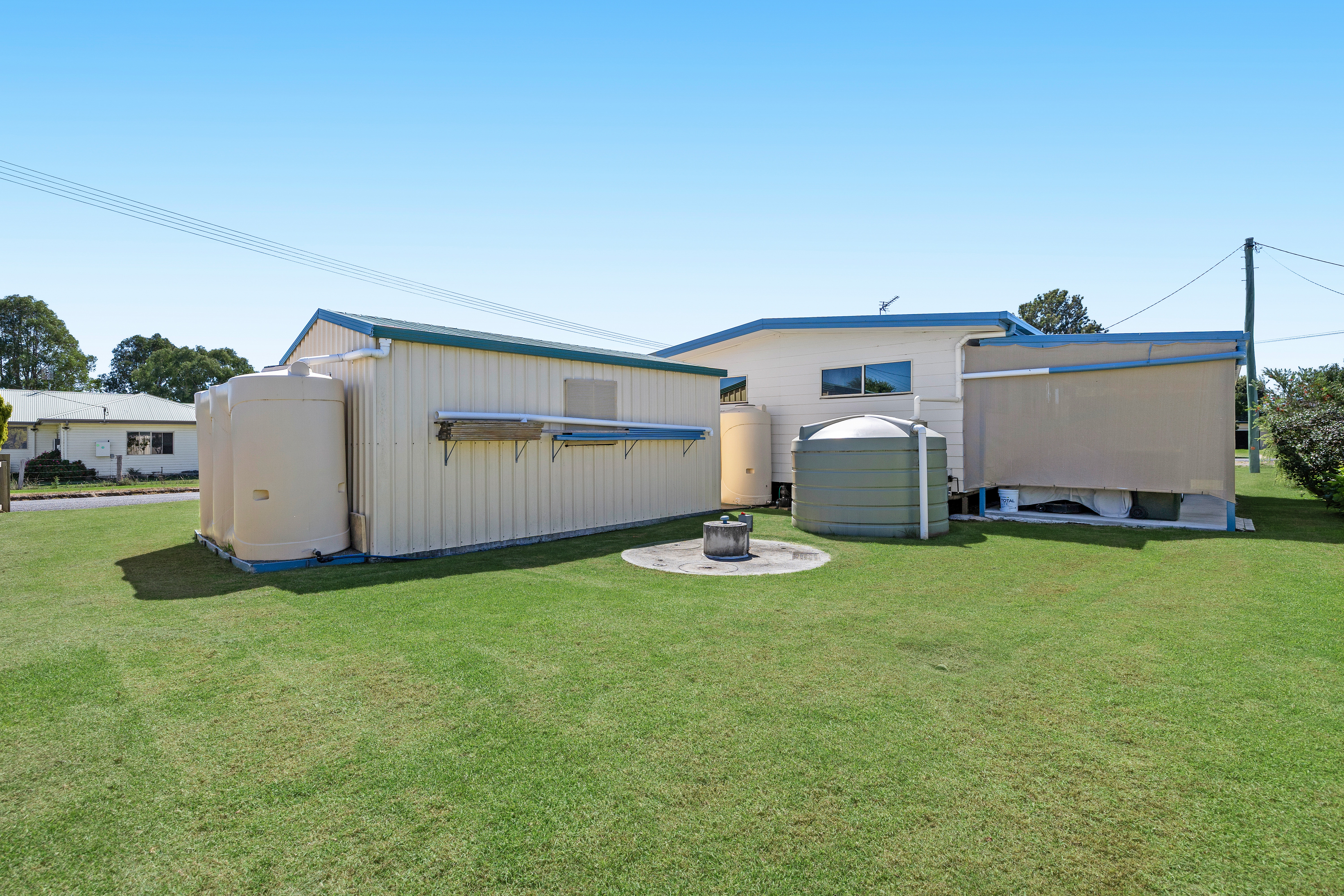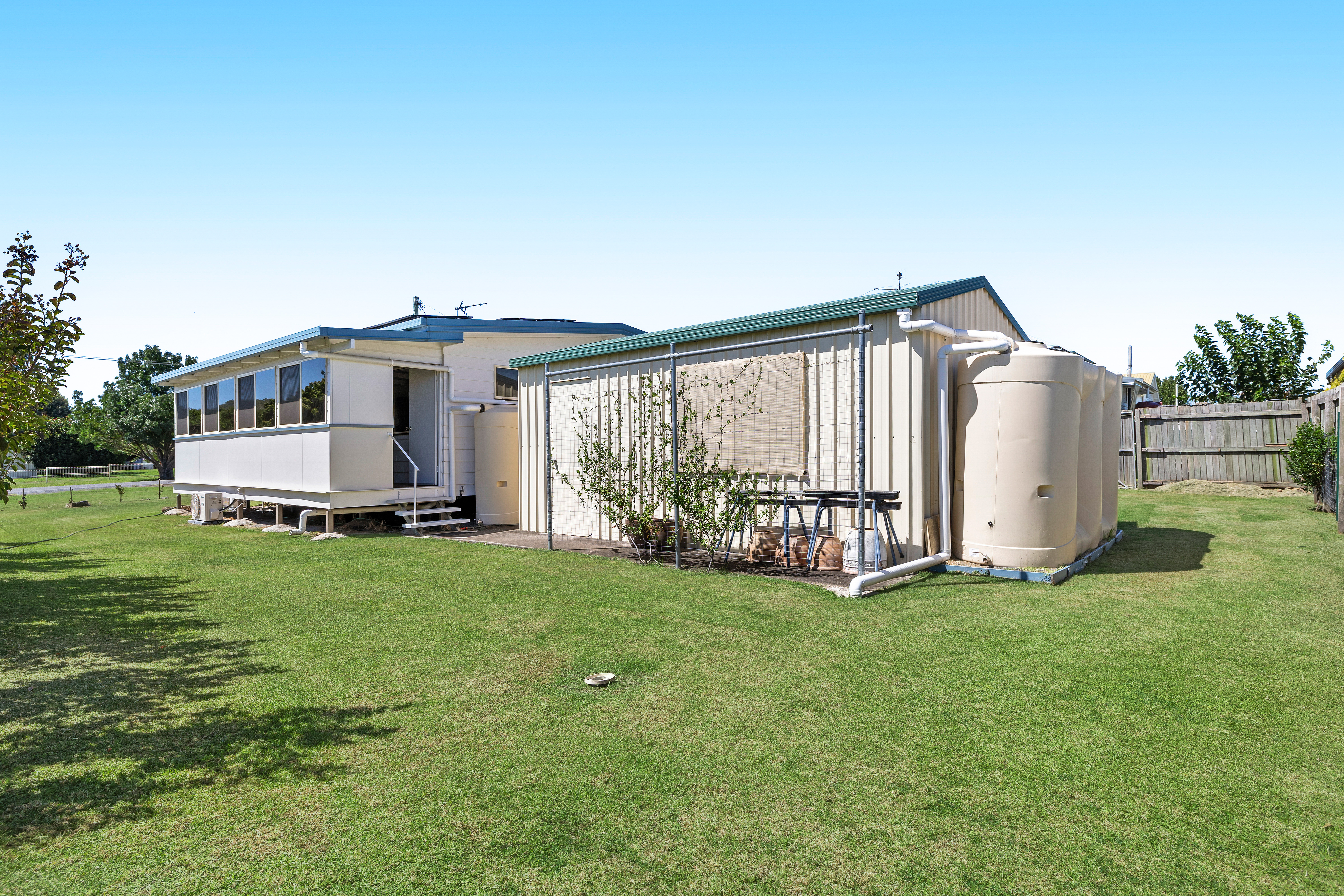The shed is ready for you with power, concrete floor and PA door. There are three rainwater tanks, with a filter system and town water connected to your home.